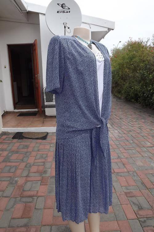 Welknown Delswa Vintage skirt and loose jacket in size 38/14. Royal blue with white. In very good condition. Polyester/Viscose combination. Pleated skirt. Blouse tie in front.