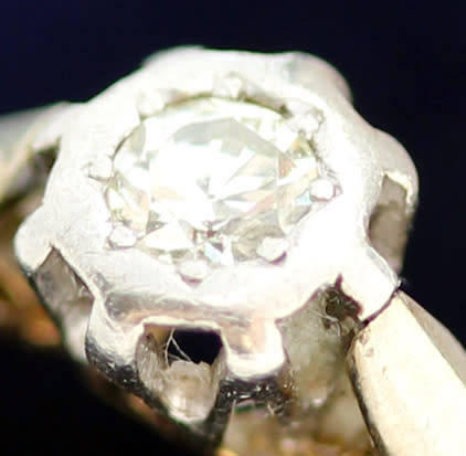 This dainty vintage very collectable piece features a single round-faceted diamond bezel set in 18ct platinum, which covers the head and shoulders; the rest of the ring is 18ct yellow gold. The ring head measures 4mm in diameter, and sits 4mm above the finger. The shank is slender, smoothly polished 9ct yellow gold. The jeweller's signature, and the word 'Plat' indicating platinum appears. The ring weighs 2,11 grams. No date mark on it but the font style, the use of platinum and 18carat gold as well as the ring head design throws it far back into English jewellery history. It was most likely an engagement ring in its previous life. The jeweller signature is Henry, Griffith & Sons, a jeweller that was established in Birmingham in 1850 before moving to Leamington after the first World War. H, G & S was closed in 1982. A dainty collectable piece of jewellery.