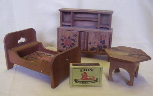 **** Doll's House - Oriental Suite **** Vintage The furniture is made from wood. The dresser doors can open. Please note that the furniture and fittings are old and some have chips, paint loss and other flaws present. The matchbox on the photo is to indicate size. ►►► Signed for postage will be R20. ◄◄◄ I will gladly combine postage and only charge what the post office charges.