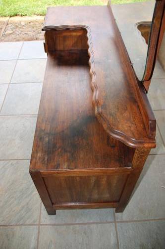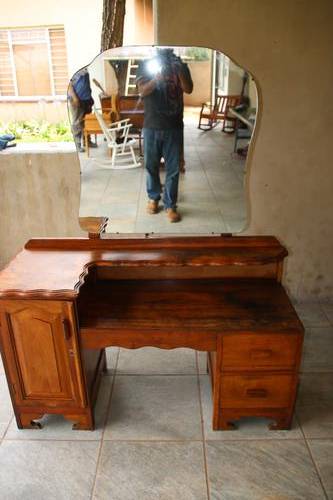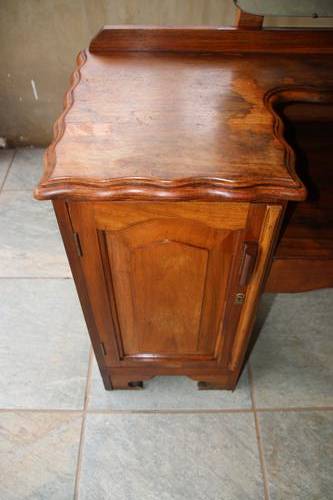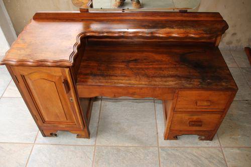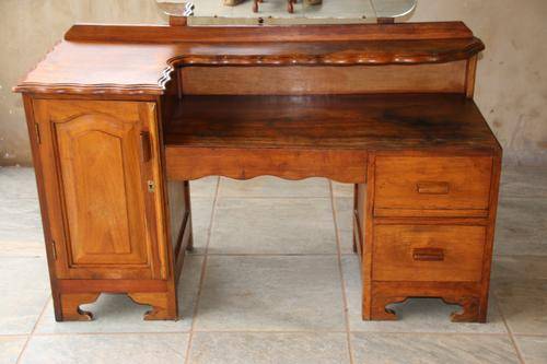 For auction is this vintage dressing table with a mirror. It is in fair condition given the discoloration of the wood. However it's structural integrity is very good. This is an ideal restoration project, possibly repainted to modernize it. Please have a good look at the pictures for the condition of the dresser as they form part of the description. This item is for collection only in Krugersdorp. Payment is due within 3 days of the auction closing.