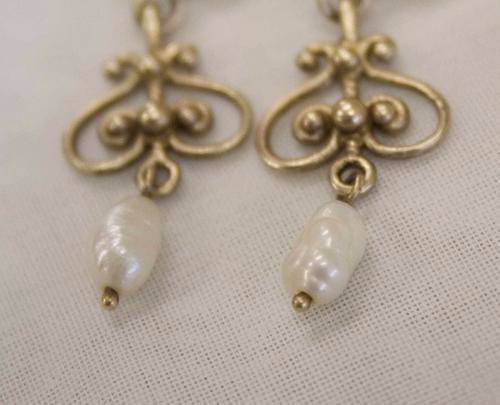 This pair of VINTAGE DROP EARRINGS - GOLD ON SILVER WITH FRESH WATER PEARLS - ATTRACTIVE PAIR, is in EXCELLENT condition. There are no cracks, chips, scratches, rubs, or signs of restoration. (see photos).     DIMENSIONS: Drop 4cm Â