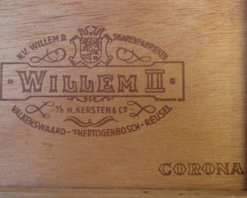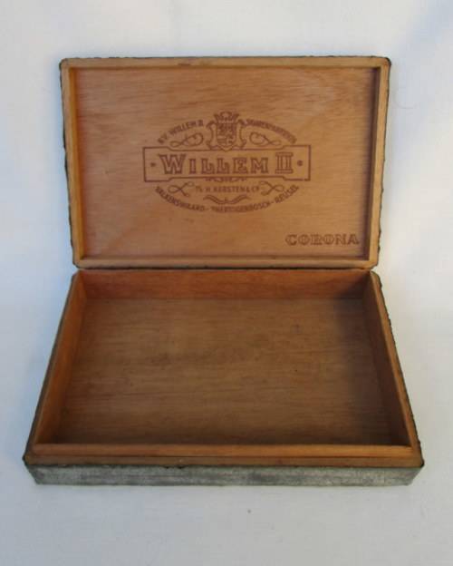 A lovely vintage Dutch Willem II Corona wooden cigar box, with lead embossed scorpion in high relief, hinged lid. minor age related wear, empty, size 22 cm x 14.5 cm x 4 cm.