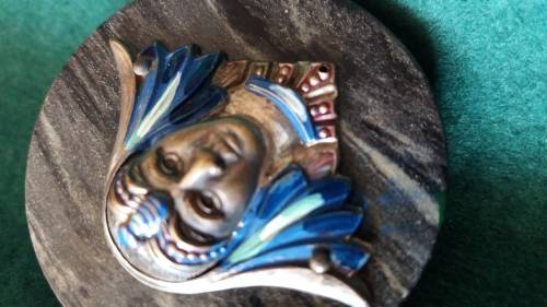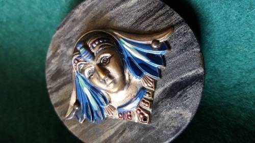 Here is an Egyptian brooch featuring Cleopatra in enamel and a white metal in very good condition with just age and use related wear. The brooch is approx 4.4cm in diameter. Please look at the pictures as they form part of the description. Payment within 3 days after close of auction. SHIPPING SAPO R70. Thanks for looking