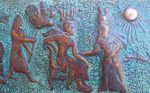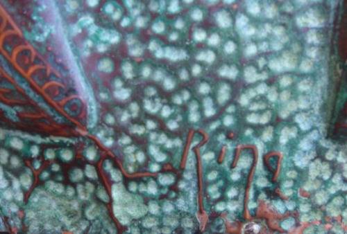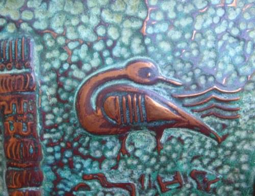 VINTAGE: STUNNING ORIGINAL, HAND HAMMERED EGYPTIAN PANEL WITH THE MOST FABULOUS NATURAL PATINA OF VERDIGRIS. SIGNED BY ARTIST - 'RINA' ON WOOD, READY TO HANG. SIZE: 54CM X 27CM.
