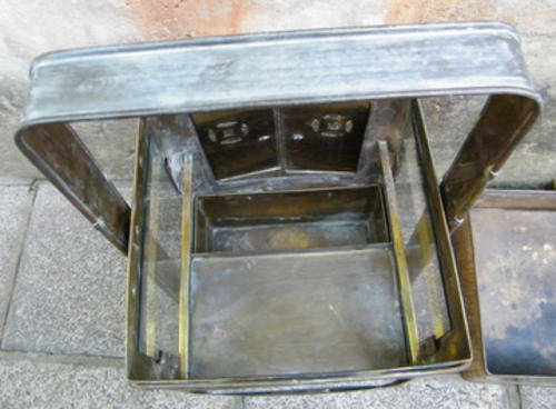 This very interesting unit was sold to me as a vintage pie warmer and pie display stand but can now be used as an interesting display and storage unit or a quirky side table. It has a holding area at the base, then a half shelf covering this, a higher full shelf and then a basket container that lifts off at the top, finished off with a sturdy handle with insulated grip. The back of the unit has 2 doors with perforation detail that open to reveal the shelves. Notice the handle on one door has come off. The electroplating on the metal is a brass color, there is some wear to the electroplating but it is still very attractive. There are 3 glass panels, notice one has a crack but these glass panels are easily replaceable as they slide in and out. The unit stands 71cm tall to the top of the handle, 59cm tall to the top of the unit excluding handle, and it measures 30.5cm square. A sturdy item weighing 6.6kg.