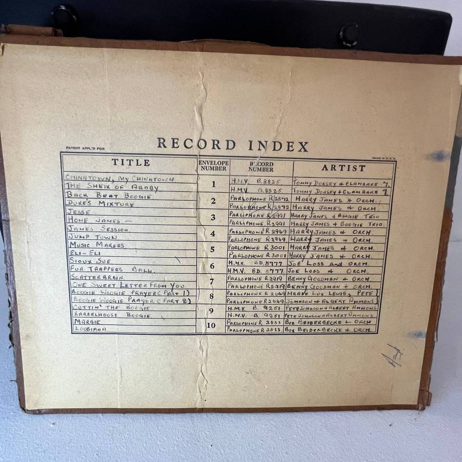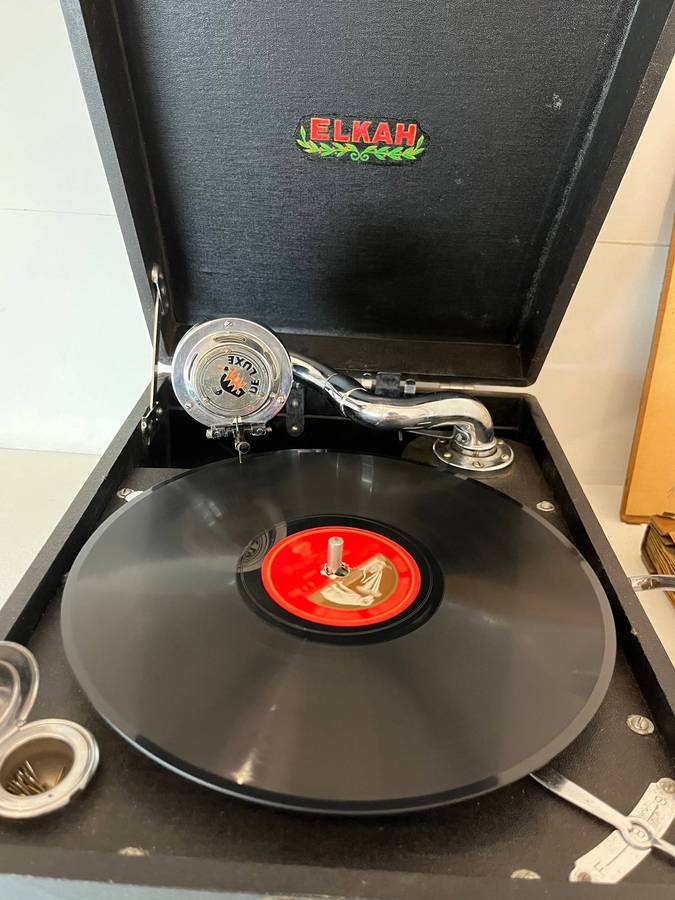 A genuine portable ELKAH gramophone with winding handle, De Luxe soundbox, needle cup, and original Record Album filled with 78 RPM shellac records. Still plays beautifully no electricity needed, just pure vintage sound. Perfect for collectors or as a striking décor piece.