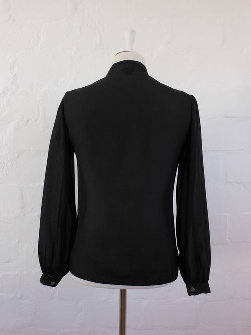 Stunning authentic vintage black blouse with embroidery and pleating to chest and ribbon pussybow tie. Very good condition, with some wear to ribbon pussybow ties. Size 8/ 32.