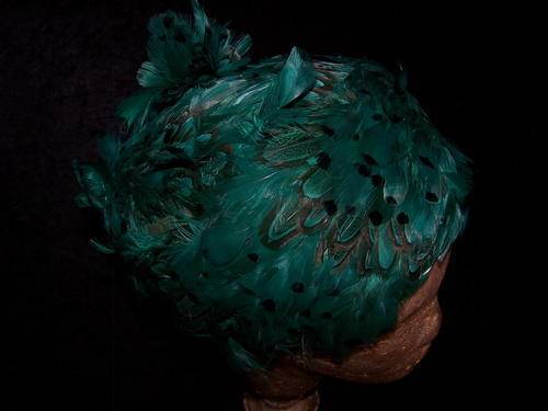 Absolutely stunning vintage emerald green and black Peacock Feather Hat, with a emerald green velvet rim and black lining.