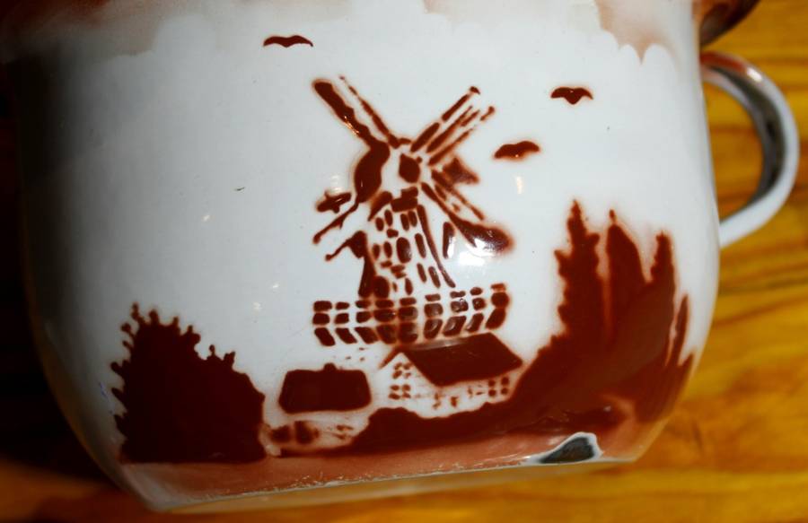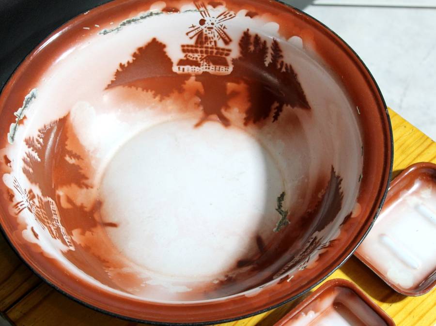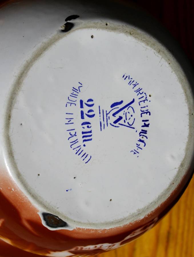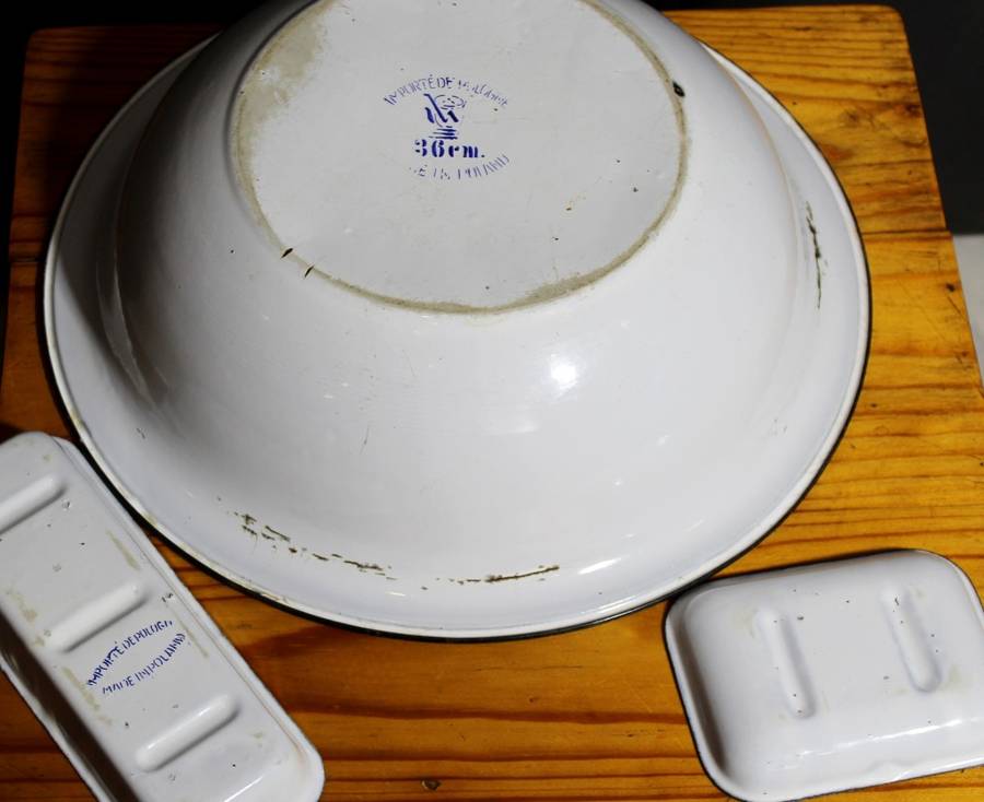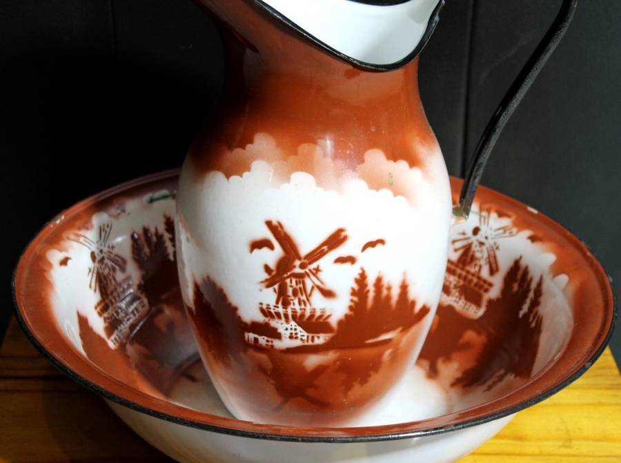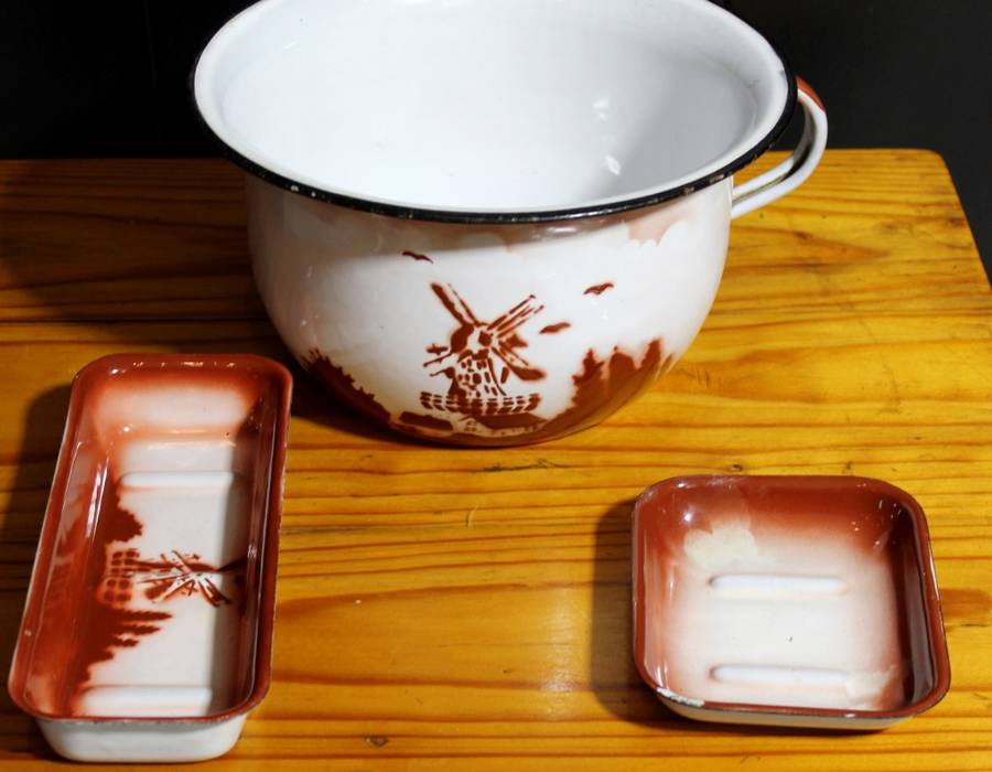 This set has a Basin (36.5cm in diameter), a pot (22cm in diameter), a jug (30cm high) and a soap holder (13cm x 10cm).