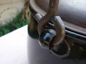 Vintage Judge Ware Ham Pot. Few rust marks inside and chips on lip but still a wonderful item to hang over your fireplace and boil that large ham. Mesures 37cm x 28cm x 22cm deep. Lid is light weight for easy on and off.