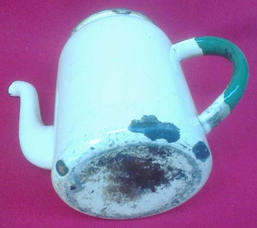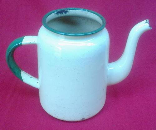 Description: Vintage ENAMEL KETTLE (cream/green trim). Ideal for use as a utility storage bowl, or as a planter for small plants/flowers. No lid. Condition: Good used condition, has seen some age related wear and tear, which includes some enamel chips. Bit of rust here and there. Needs a good clean. Approximate size: 115mm diam. x 150mm high. Other: Slight colour variations possible between picture and real item. Please regard pictures as part of the description of the item.