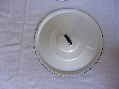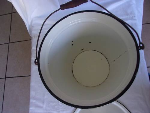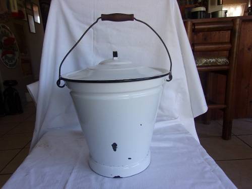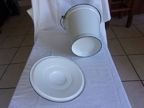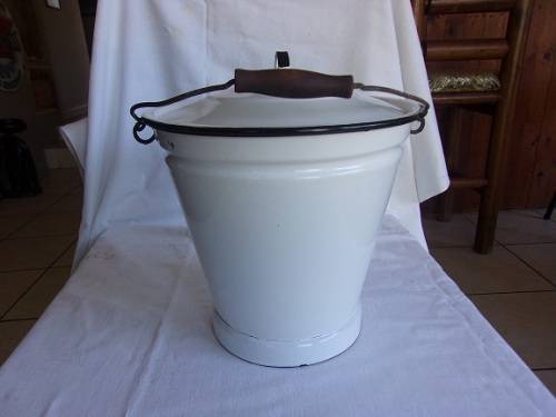 Vintage enamel slop bucket with lid. I would date this old slop bucket with lid to the 1960s. It is white with black trim, and has a metal handle with a wodden hand piece. The bucket stands 30cm high and is 30cm in diamater at the top. It is in good condition. Great buy for your vintage kitchen.