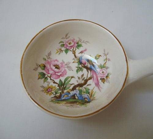 An ivory glazed china soup ladle, decorated with a polychrome transfer-printed vignette of an