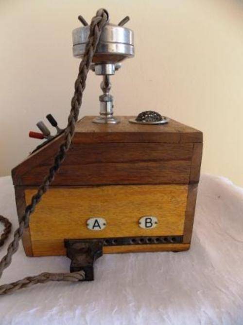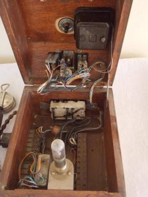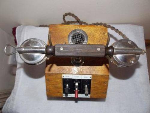 VINTAGE EXCHANGE TELEPHONE SOLID OAK CASE, NICKLE PLATED, BRASS SCREWS AND BAKELITE HANDLE. NO PARTICULARS OF MAKE OR MODEL ON THE PHONE. NOT TESTED. HEIGHT 33cm, LENGTH 20cm WIDTH 23cm. SHIPPING COSTS R65.00