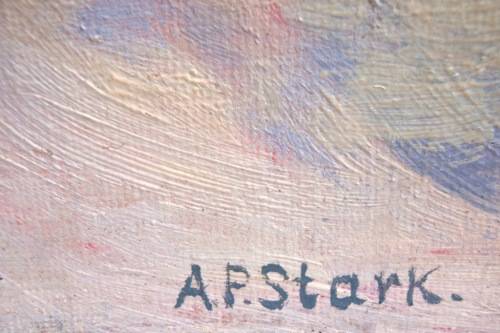 VINTAGE: ORIGINAL OIL by A.P.STARK 'A WINTER'S DAY'. THE ARTIST HAS CAPTURED THE SILENCE OF A SNOWY LANDSCAPE SO BEAUTIFULLY. OIL ON THICK BOARD, SIZE: 45CM X 35CM. UNFRAMED