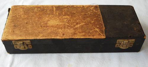 The box is in good condition but some of the outer leather covering having been torn off the top of the box. The clasps are in good working order.