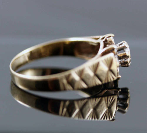 This unusual ring features a floral design of sparkling 9 x small round-cut diamonds claw set into 9ct yellow gold, forming petals that surround a small round-cut diamond as the focal point of the flower. This has a high ring head - the flower stands proud of the fairly broad shank (5mm wide as it connects with the ring head). The central gemstone is raised on extended claws, forming a coronet that sits 4,5mm above the finger. A strong, modern criss-cross diamond pattern is etched into the surface of the shank. This vintage piece shows quite a lot of wear from its years of history although the diamonds are still excellent and very few of the buff marks can be seen without the help of a magnifying glass. The hallmarks have almost worn away, but the jeweller's signature is still evident. I have had the ring checked and evaluated by an independent jeweller. His certificate for R6'792 will accompany the ring, which will be sent in a quality ring box.