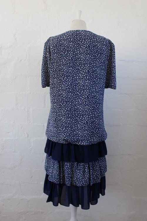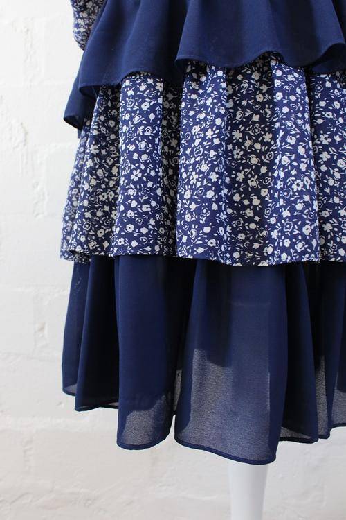 VINTAGE FLORAL PRINT BLUE WHITE TIERED LAYERED DRESS - SIZE 14