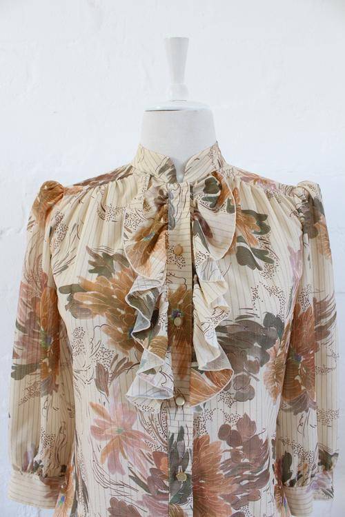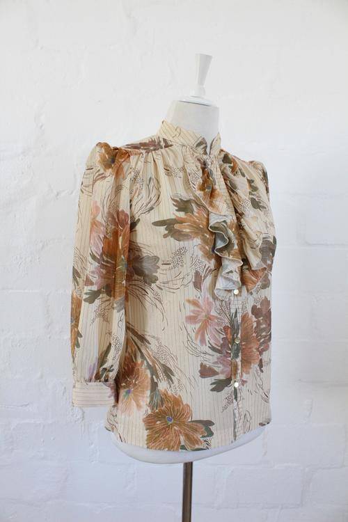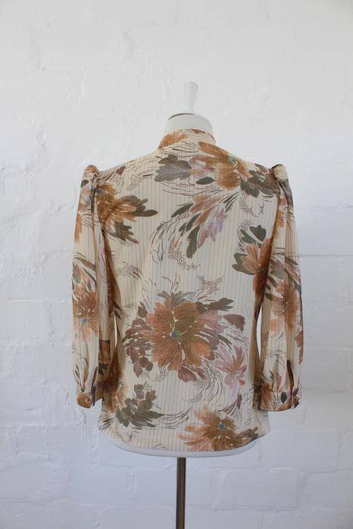 VINTAGE FLORAL PRINT CREAM BROWN PINSTRIPE BLOUSE TOP SHIRT - SIZE 10