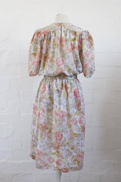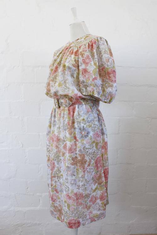 VINTAGE FLORAL PRINT PINK WHITE BELTED DAY DRESS - SIZE 16
