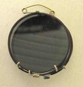 A pair of vintage fold-up clip-on sunglasses together with their original red leather pouch. Glass lenses. Condition good (pouch needs polishing). Diameter of each lens 41 mm.