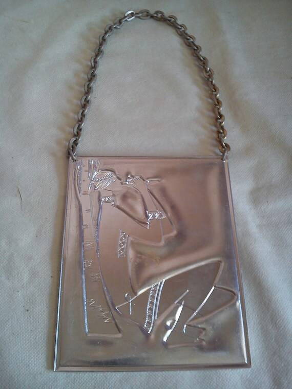 Measures approx. 12 cm x 15 cm. There hung aluminum chain for hanging on the wall.