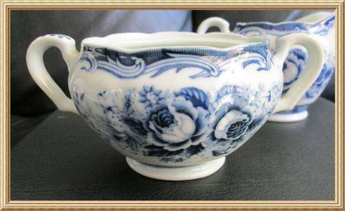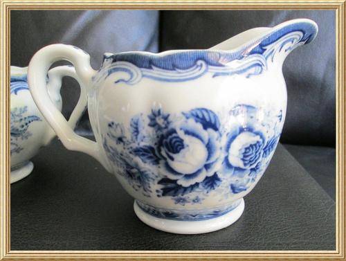 For the lovers of blue and white a lovely vintage pair of Japanese Fine China " Blue Rose " Footed Milk Jug and Sugar Bowl, in good condition, Milk Jug 9cm height, 13cm width, Sugar Bowl 7cm height, 15.5cm width.