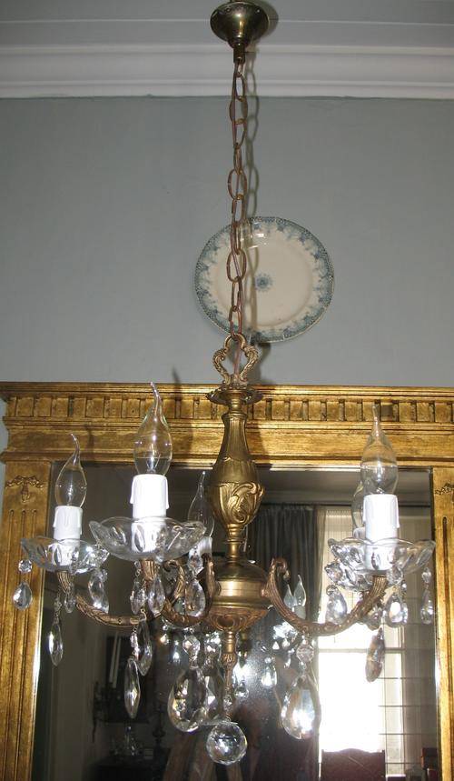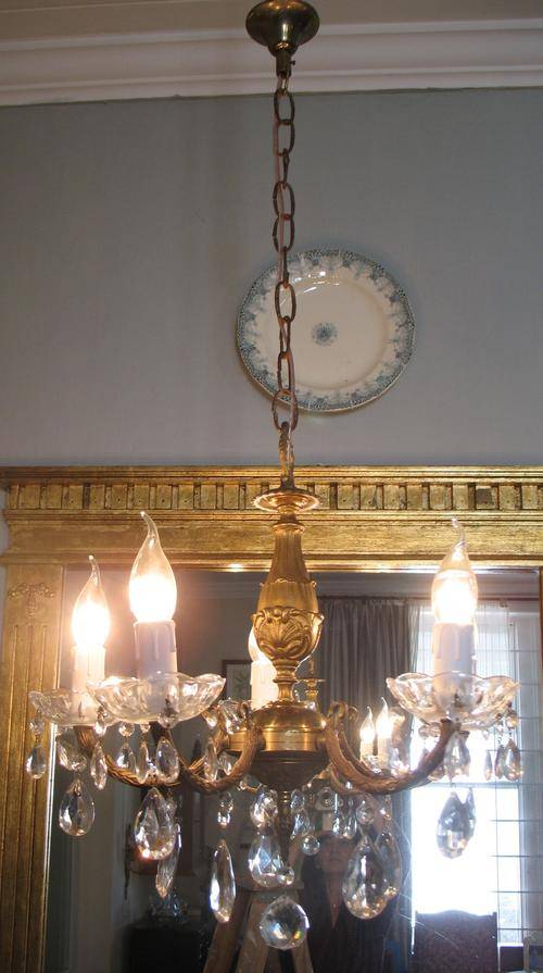 Vintage french brass and crystal five light chandelier