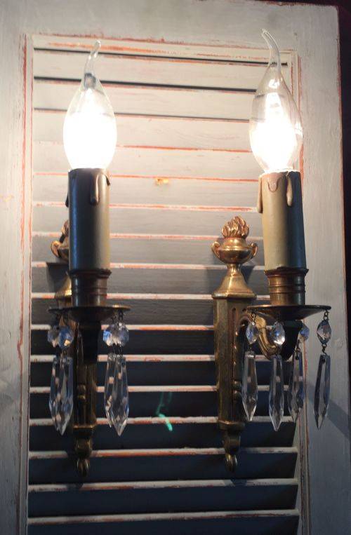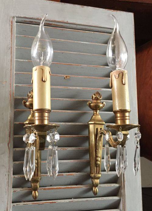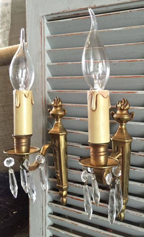 Lovely pair in good working condition, no crystals missing. These take standard bulbs available at any hardware store.