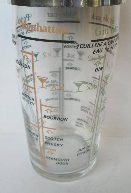 Vintage French Glass Cocktail Mixer / Shaker with Recipes, 21 cm high.