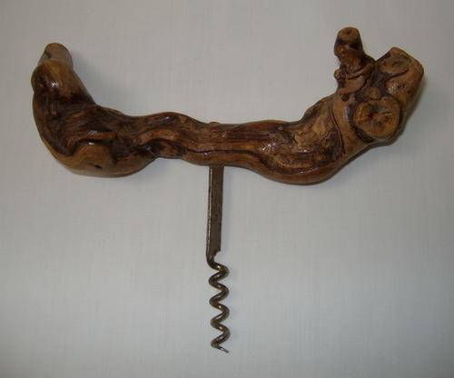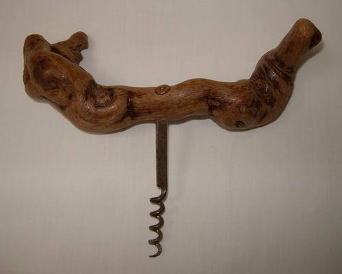 A varnished grapevine wood corkscrew, with steel helix.