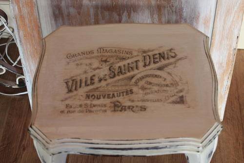 I gave this gal a few coats of my home made chalk paint. I used an antique off-white colour. Then I began the antique shabby finish by sanding along all the edges to give her that time worn look!! Then it was ready for my amazing French Ville De Saint Denis graphic!!