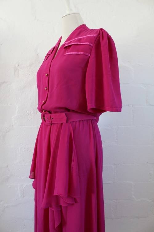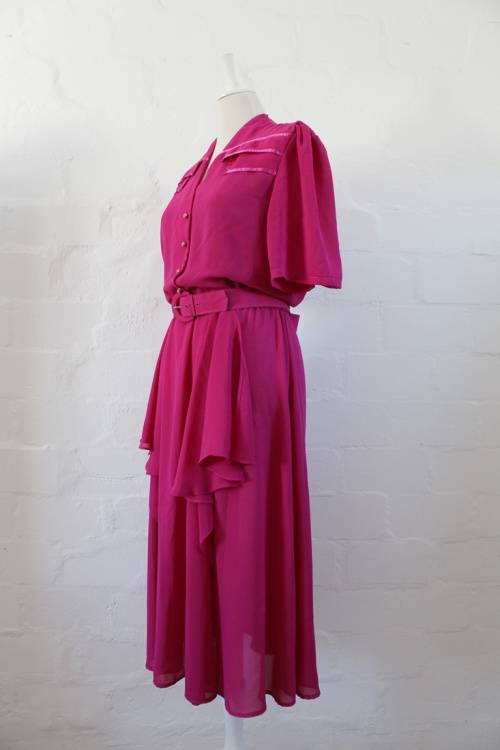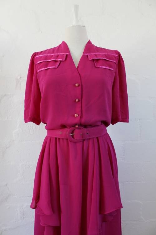 Stunning, quality authentic vintage fuschia pink ruffle front belted dress with ribbon trim pocket detail to shoulders. Top is lined.
