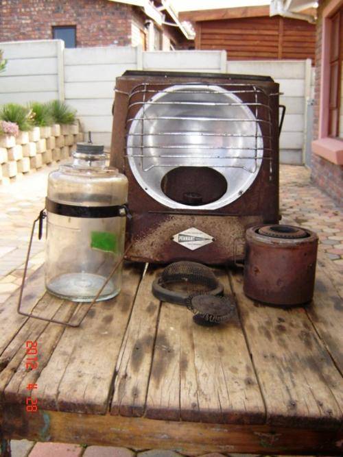FYRSIDE RIPPINGILES PARAFFIN HEATER WITH INTACT KEROSENE BOTTLE. NO WICK - OTHERWISE 100% COMPLETE. MADE IN ENGLAND IN 1953. DON'T MISS OUT ON THIS ONE!! P&P IN S.A. R105.00