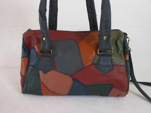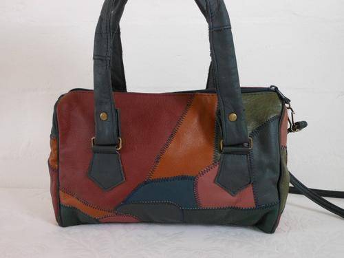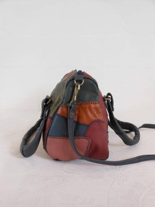 Stunning authentic vintage real leather patchwork bowler's style bag with long strap. Very good condition. Bag measures 28 cm x 24 cm x 11 cm. Removable strap 115 cm.