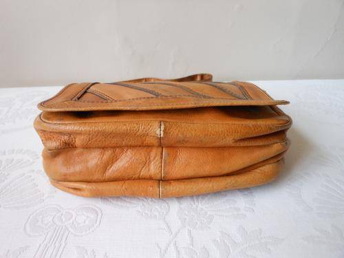 Authentic vintage rustic leather handbag. Label inside reads "Genuine leather, made in Colombia". Good condition, with some signs of wear/ marks/ stains etc (see photos). There is a small tear on back pocket and another small tear to one of the inner section dividers. Bag measures 25 cm x 22 cm x 12 cm. Strap measures 72 cm.