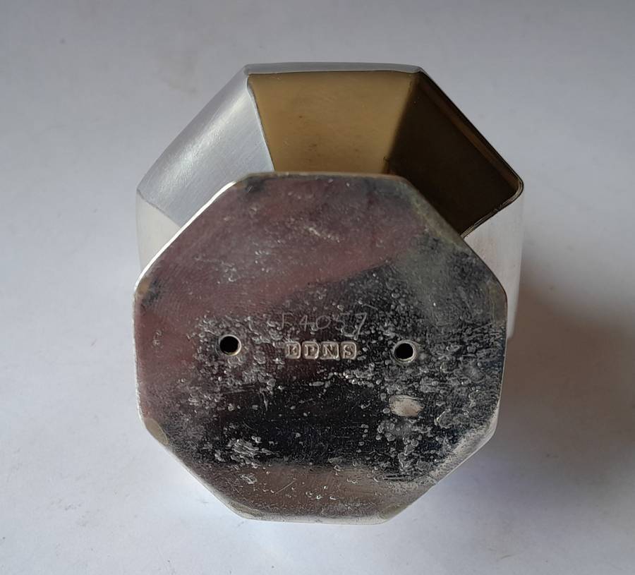 A vintage silver-plated sugar shaker in the classic Georgian style. Stamped E.P.N.S. (electro plated nickel silver) and numbered "F4057".