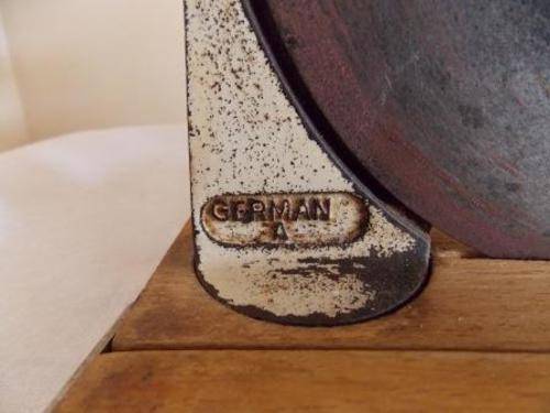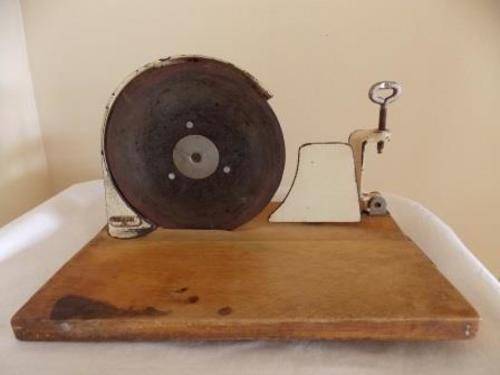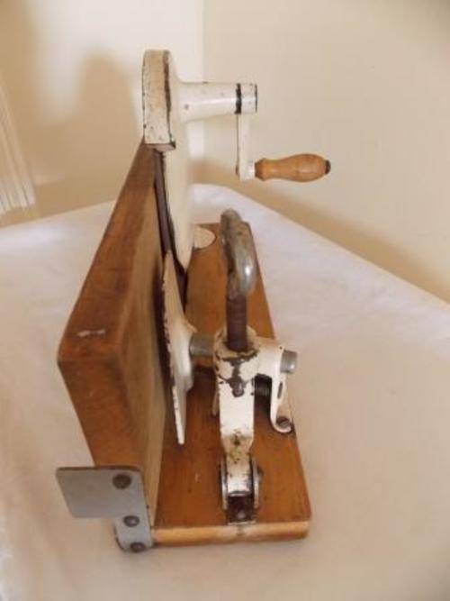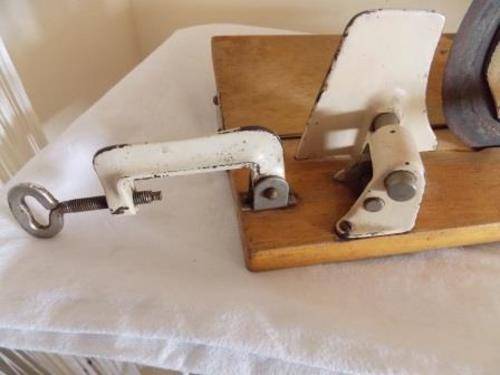 VINTAGE GERMAN TYPE CAST IRON & WOOD BREAD SLICER IN GOOD CONDITION. SHIPPING COSTS R75.00