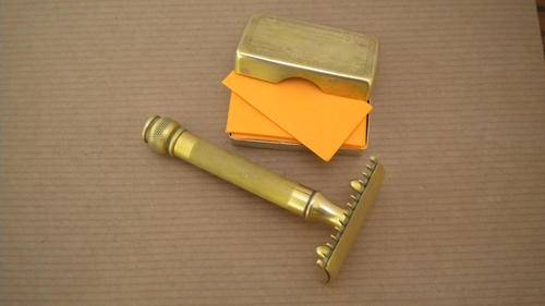 Razor is made of rolled sheet metal with a knurled ball end handle.