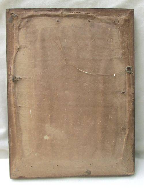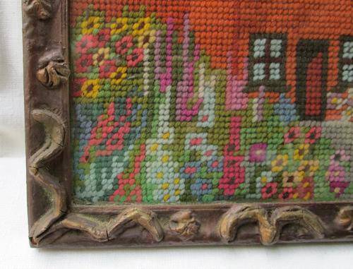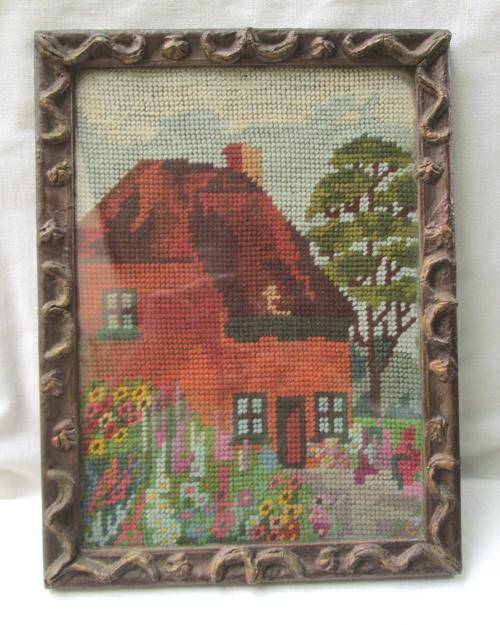 Vintage Glass Framed Tapestry - House Scene. Size 22 cm x 29 cm.