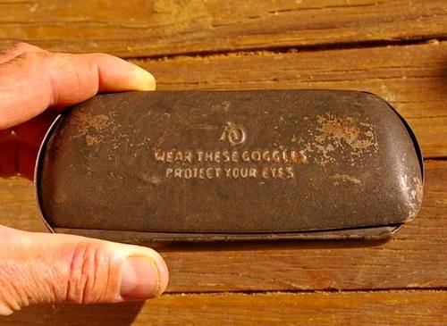 Vintage metal goggle case.  AO trade mark.  Good working condition with much wear on outside and nice patina.