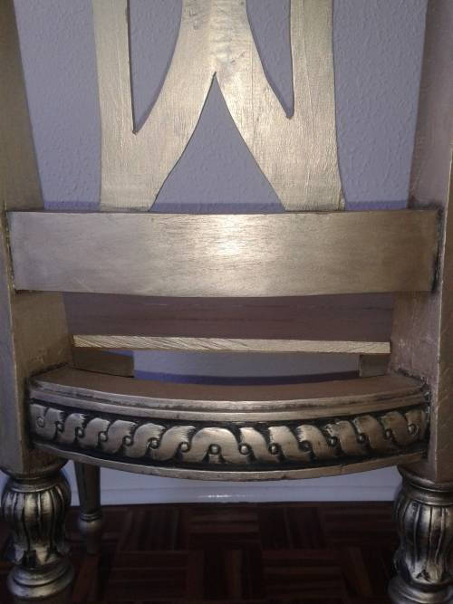 Beautifull, very sturdy vintage chair. Does not look painted more like a gilders paste effect. Has only one piece of wood missing at the back of seat. Self collect or arrange own courier. Approx. Measurements 100 cm. Seat 50 height side to side 50cm, 40cm.