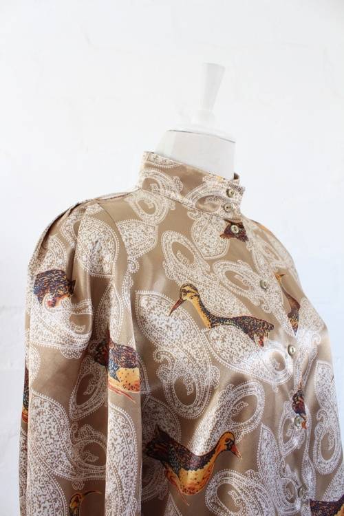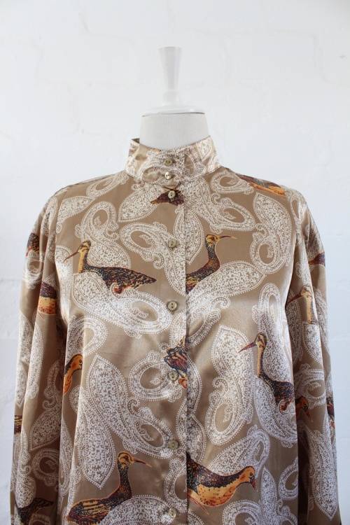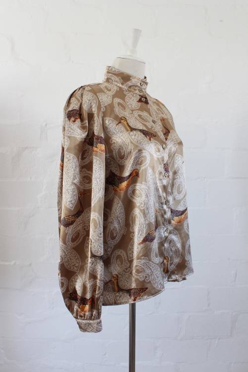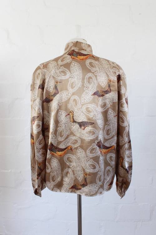 VINTAGE GOLD PAISLEY BIRD PRINT LONG SLEEVE BLOUSE SHIRT TOP - SIZE 12