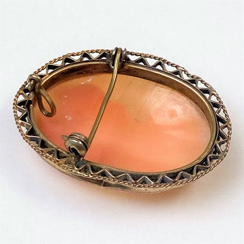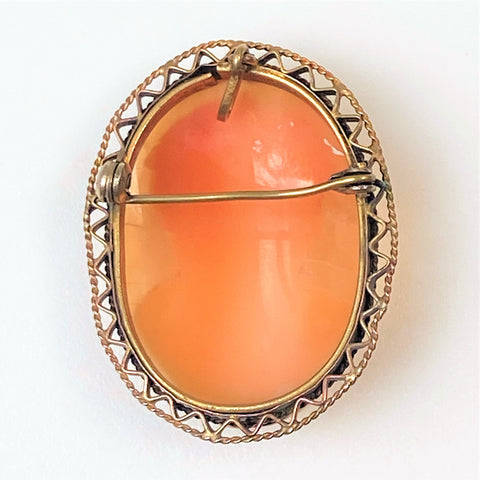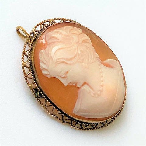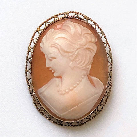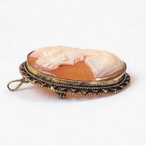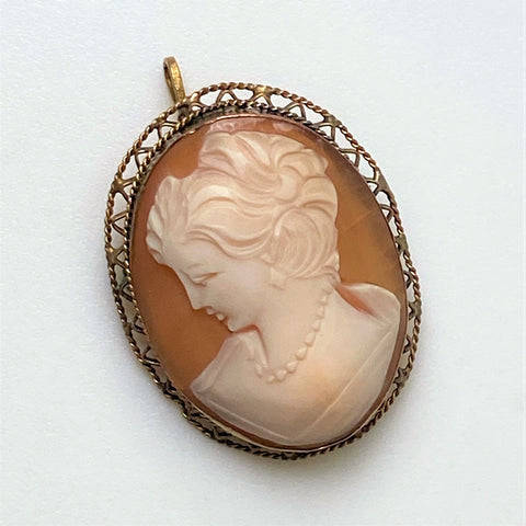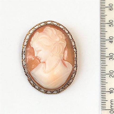 The vintage yellow gold-plated brooch has an oval shell cameo (36mm x 27mm), of a pretty lady looking left. The cameo is tube-set into decorative surround of gold-plated metal. There is a bale to enable the item to be worn alternatively as a pendant.