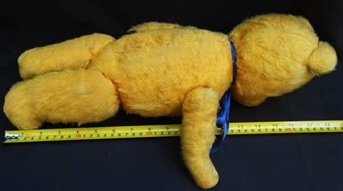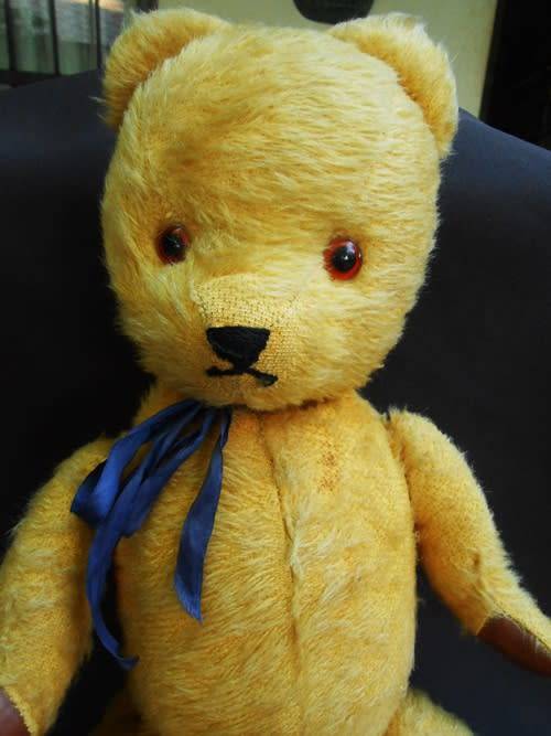 This lovely golden mohair bear is in a very good clean condition for its age.The two bears must have belonged to two girls in the same family because they are in such a good condition. Bear no 1 is slightly more faded than the other one. Both are more faded in front than at the back.They are still wearing the original blue ribbons that they came with. Now faded.The bears are probably made after World War II because the arms and legs are shorter to save fabric. the heads are hard, stuffed with woodwool. the growlers in the back are not working. they have brown glass eyes and the noses look original. they have not been 'restored '. They are 44 cm tall.Very collectable in their original condition. made in South Africa by Ark.