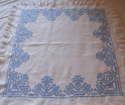 VINTAGE: LOVELY HAND EMBROIDERED (CROSS STITCH) TABLECLOTH WITH BEAUTIFUL FINE HAND CROCHETED FRILLY EDGE. CLOTH IN GOOD CONDITION - BUT PLEASE NOTE THAT IS DOES HAVE SOME STAINS. SIZE: 92CM X 92CM.