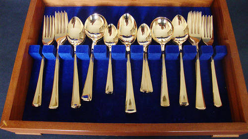 STUNNING VINTAGE GRAWE & HILL STAINLESS STEEL 18/8 GOLD PLATED 44 PIECE CANTEEN OF CUTLERY - WOODEN PRESENTATION BOX INTERIOR LINED WITH BLUE VELVET - HARRODS