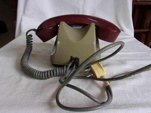 Vintage grey and maroon AEI RSA rotary dial telephone. I would estimate that this phone dates to the 1960s. Sometimes called the "horseshoe phone" because of its shape of the front, it is grey with a maroon receiver and is made from hard plastic. The telephone is in good condition, with its original wiring. The rotary number dial still works perfectly. It is not tested as the telephone jack differs to today's jacks. Great buy for the collector.
