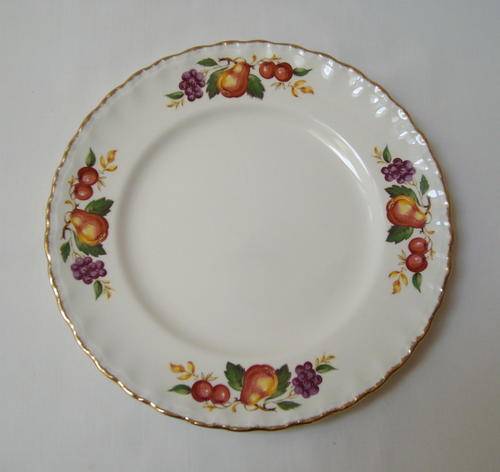 transfer-printed pears, apples and bunches of grapes, gilt edged pie-crust rim.