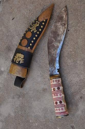 VINTAGE GURKHAN DAGGER IN LEATHER SCABBARD AND CARVED BONE HANDLE